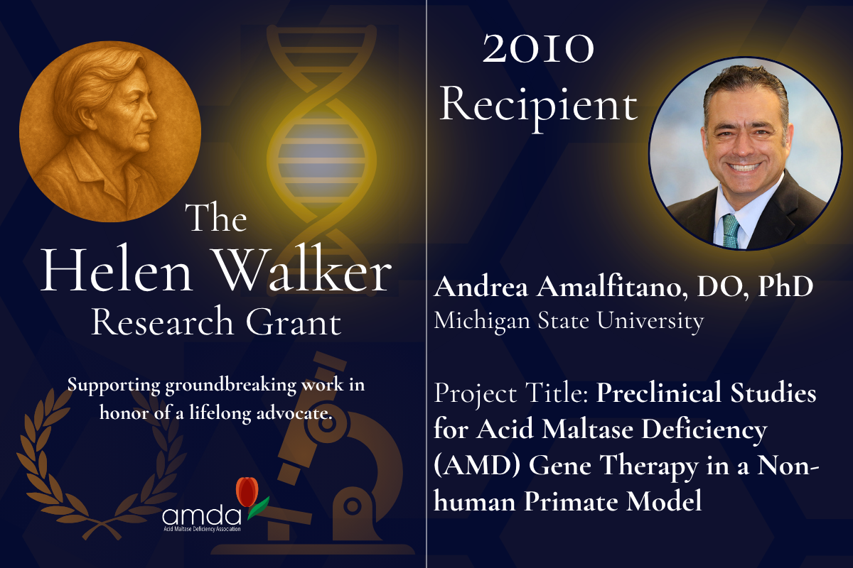 In 2010, the AMDA awarded the Helen Walker Research Grant to Andrea Amalfitano, DO, PhD, at Michigan State University, to support a project focused on developing gene therapy approaches for Pompe disease. The goal of the project was to evaluate whether delivering the GAA gene to the liver using advanced viral vectors could enable long-term production and systemic distribution of the enzyme needed to treat the disease.