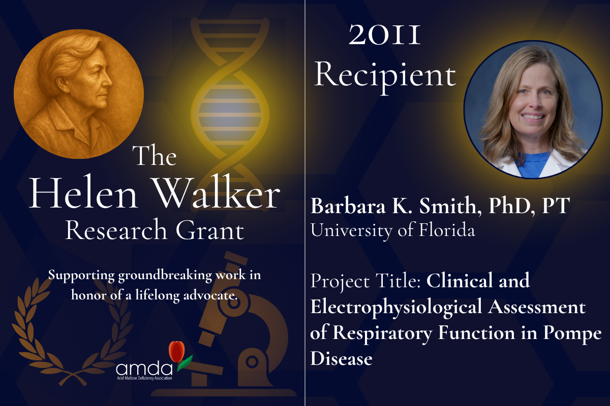 In 2011, the AMDA awarded the Helen Walker Research Grant to Barbara K. Smith, PhD, PT, at the University of Florida, to support a project focused on understanding respiratory muscle dysfunction in Pompe disease. Although enzyme replacement therapy has improved survival and quality of life for many individuals, respiratory weakness and ventilatory insufficiency remain common and serious complications.