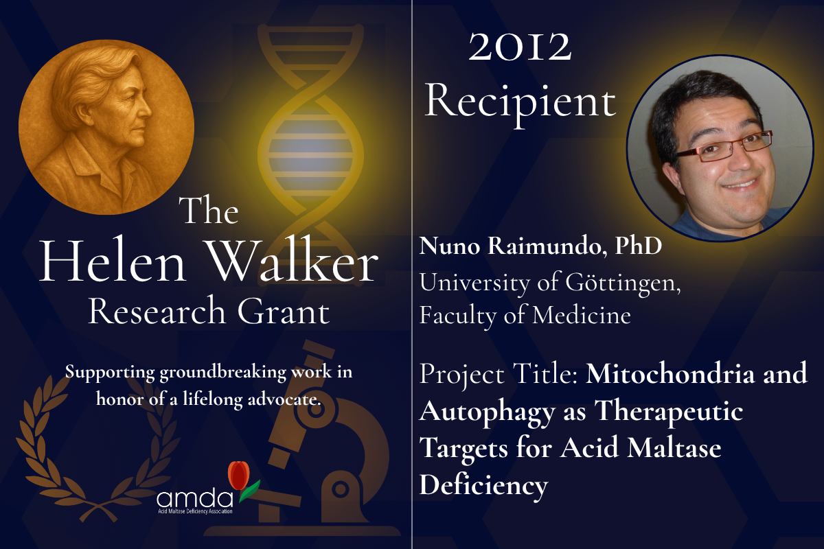 In 2012, the AMDA awarded the Helen Walker Research Grant to Nuno Raimundo, PhD, at the University of Göttingen, Faculty of Medicine, in Germany, to investigate new therapeutic strategies aimed at improving muscle function in Pompe disease. While enzyme replacement therapy has significantly improved patient outcomes, it primarily addresses the underlying enzyme deficiency and may not fully correct the complex cellular dysfunction associated with the disease.