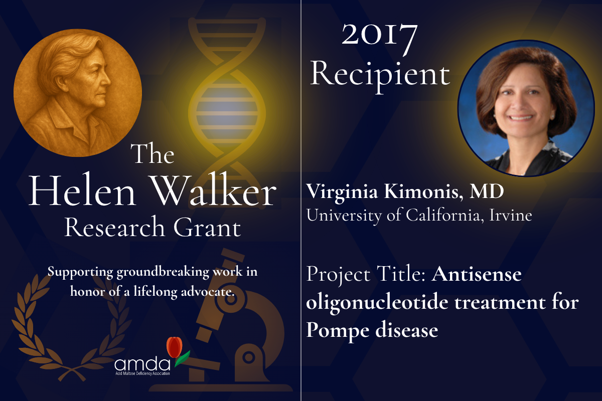 In 2017, the AMDA awarded the Helen Walker Research Grant to Virginia Kimonis, MD, and her research team at the University of California, Irvine, to support a project focused on developing a potential new therapeutic approach for Pompe disease using antisense oligonucleotide (ASO) technology.