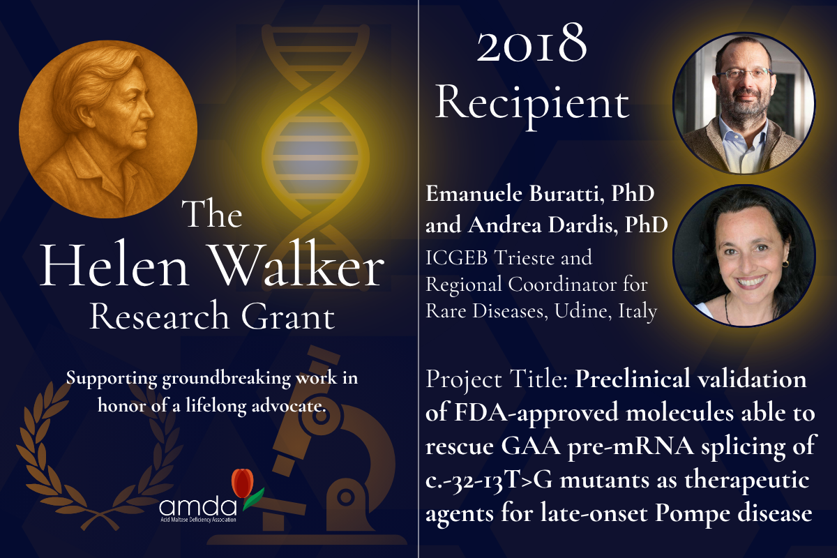 In 2018, the AMDA awarded the Helen Walker Research Grant to Emanuele Buratti, PhD, and Andrea Dardis, PhD, at the International Centre for Genetic Engineering and Biotechnology (ICGEB) in Trieste and the Regional Coordinator Centre for Rare Diseases in Udine, Italy, to support a project focused on developing therapeutic strategies that correct RNA splicing defects in Pompe disease.