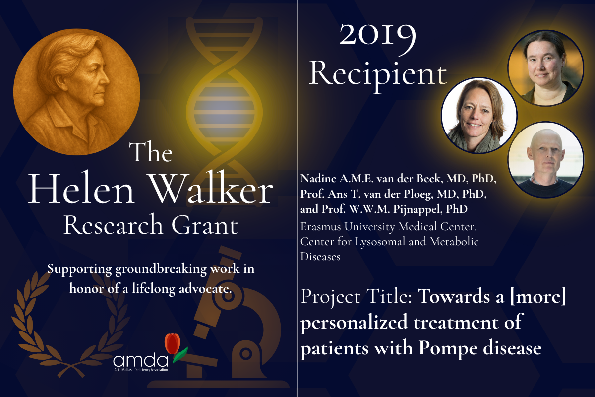 In 2019, the AMDA awarded the Helen Walker Research Grant to researchers at Erasmus MC University Medical Center in Rotterdam, The Netherlands. The project, led by Nadine A.M.E. van der Beek, MD, PhD, focused on understanding why patients with Pompe disease respond differently to enzyme replacement therapy (ERT).