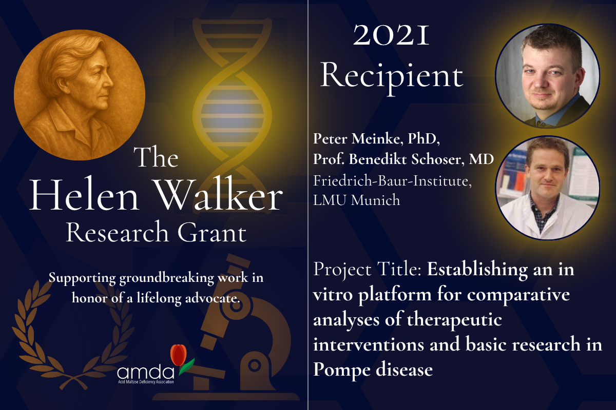 In 2021, the AMDA awarded the Helen Walker Research Grant to Peter Meinke, PhD, and Prof. Benedikt Schoser, MD, at the Friedrich-Baur-Institute, LMU Munich, to support a project focused on developing a standardized in vitro platform for Pompe disease research. The project centers on generating and characterizing human muscle cell models derived from individuals with different GAA mutations.