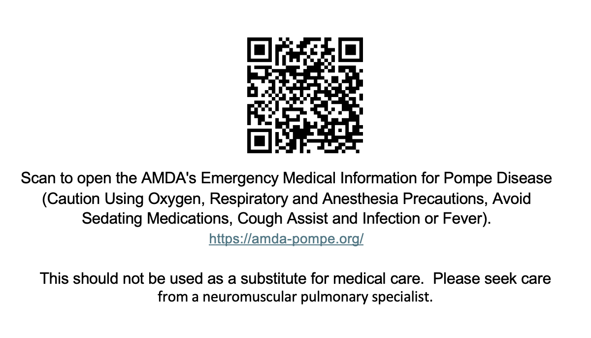 To make that easier, the AMDA developed the Pompe Medical Alert Card, modeled after and created with the kind permission of Breathe with MD, Inc.