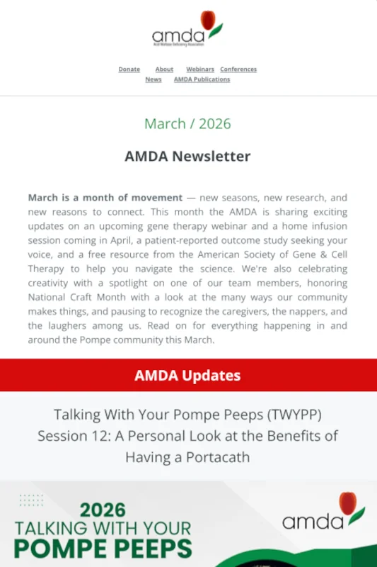 The AMDA publishes a monthly newsletter with updates for the Pompe community, including upcoming events, educational opportunities, advocacy and research news, and helpful resources. Use this archive to explore past issues and catch up on announcements you may have missed. New newsletters are added as they’re released.